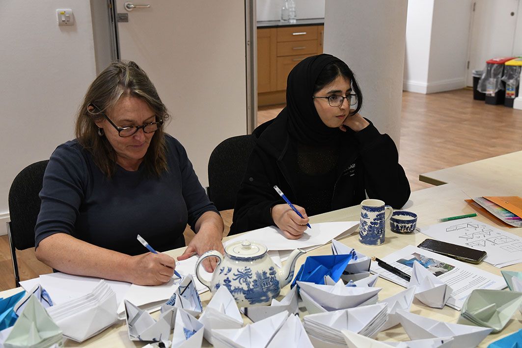 Gathering inspiration from poetry and antique blue and white willow pattern pottery placed at the centre of the table, the attendees began to add writing and illustrations to their work. As the confidence grew so did the size of the creations- the boats became much larger involving 2 or more people to help with the folding.